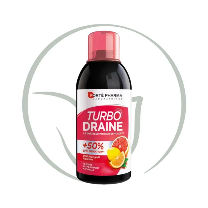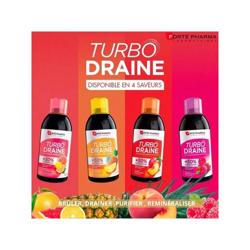 ACTIONS PRODUIT : Spécialement formulé par le Département Recherche et Développement des Laboratoires Forté Pharma, Turbodraine associe des actifs d'origine végétale pour vous offrir un allié minceur au bon goût. Draineur complet, Turbodraine vous aide à :